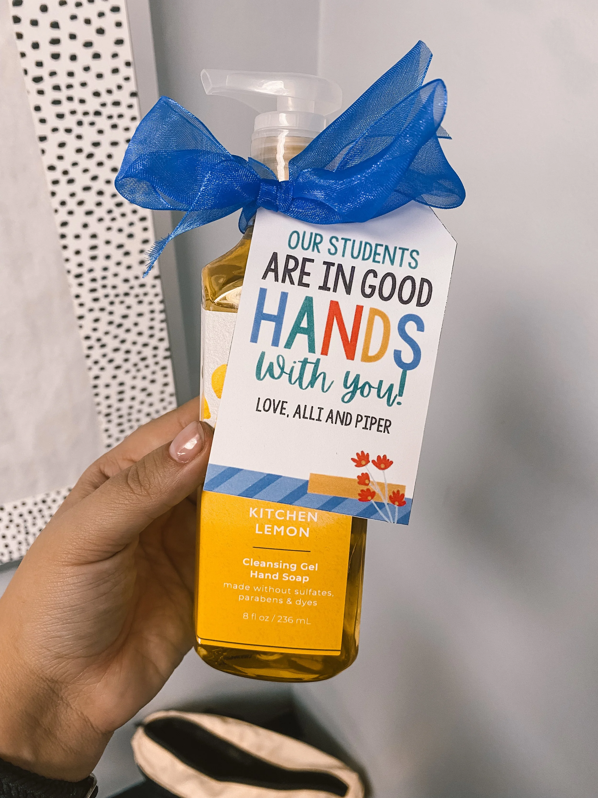 I bought a roll of this ribbon, enough soaps for each coworker to get one, & this cutie printable card to make my life so much easier (BONUS! It’s currently 10% off)! Here is a link to her whole page — she’s got TONS of cute options that I always take advantage of)! So affordable & encouraging a little extra cleanliness is perfect for the germ-infested winter months! ;)