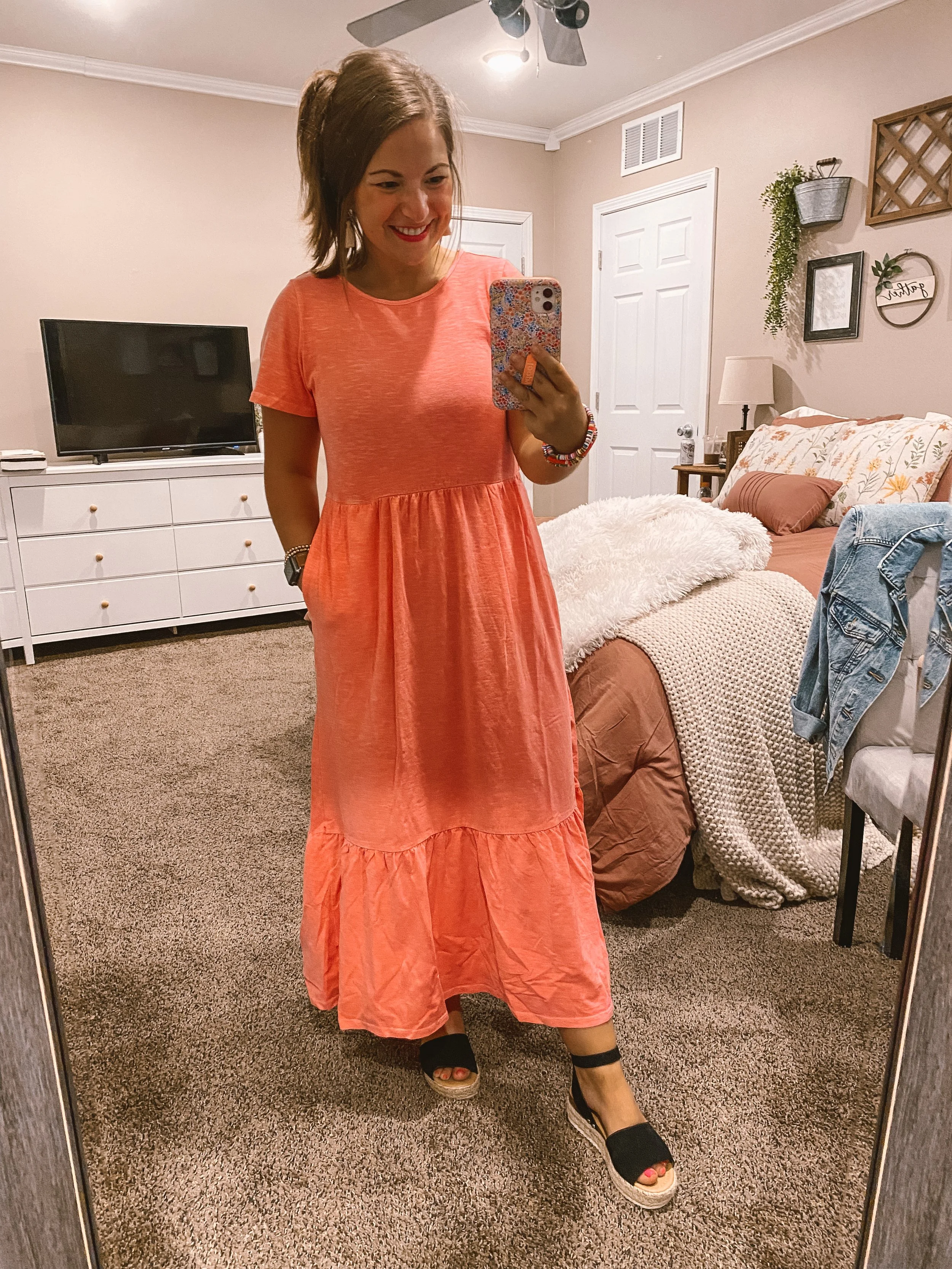 I have this dress but in the shorter version & absolutely love it so when I saw this longer style, I knew I had to try it! The material is a little bit different & it fits a little bit smaller than the shorter styles, but it’s still super comfy & I love the pockets! I’m wearing a small & would say it fits true to size. It comes in a few other color options as well!