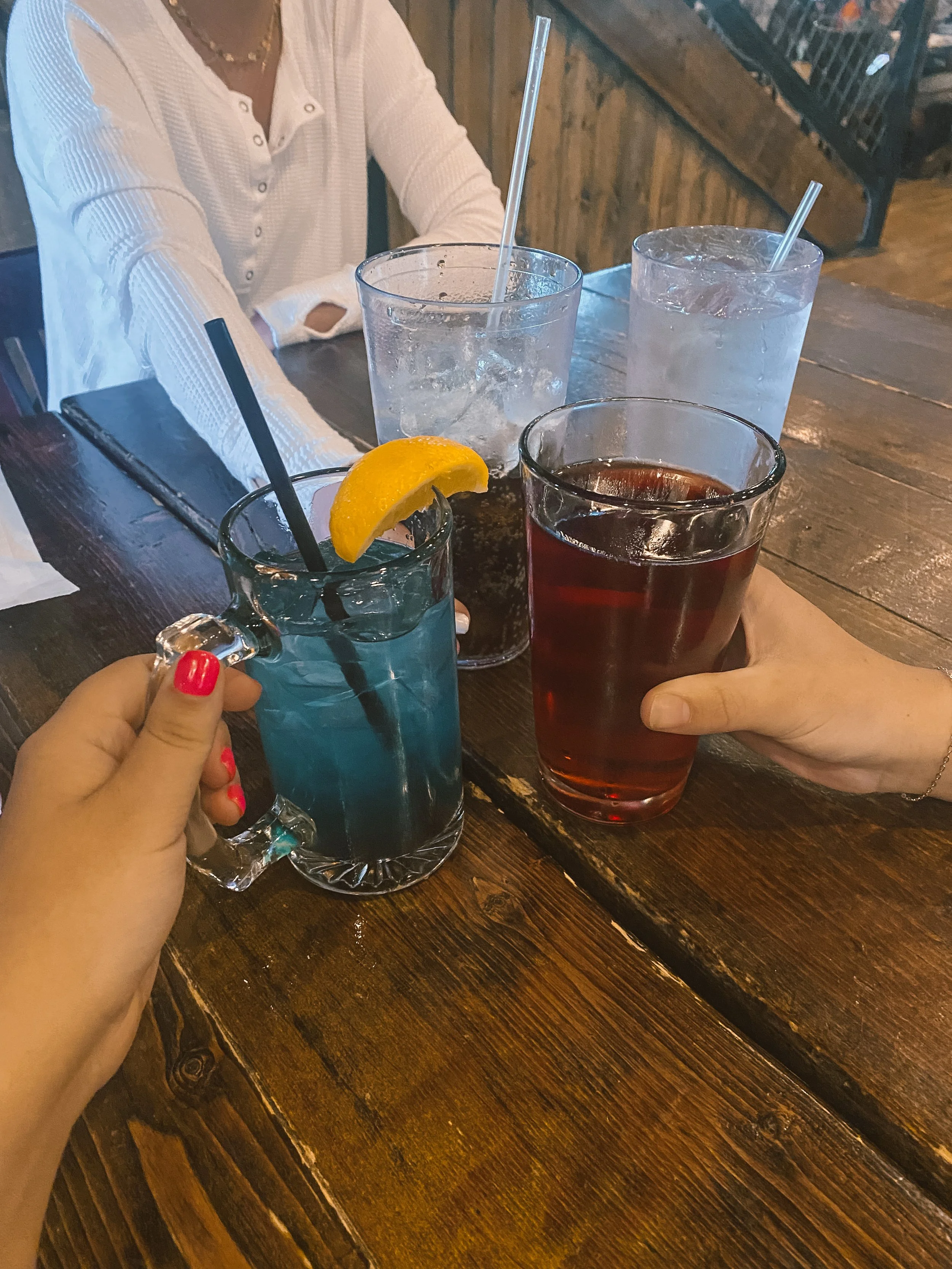 We were STARVING & dirty & hot. We went to the Hochatown Saloon for a late lunch. I inhaled my burger & fried okra, but I did snag a picture of our cute drinks (including Avery’s diet coke lol).