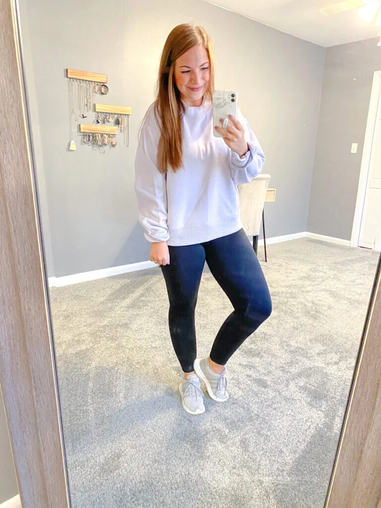 above picture details linked here:lavender crewneck / adidas sneakers / seamless black leggings / thin black scrunchie / lip color (shade is called "girl power") / purple nail polish (shade is "#3106") / dainty gold mini coin necklace / favorite comfy padded bra / white marble loopy phone case (get 10% off using code smalltown10!) / wooden jewelry wall hanging