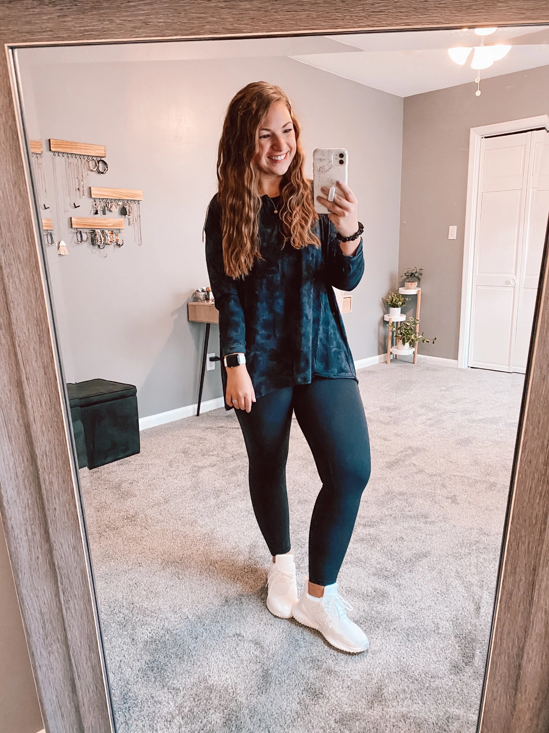 Picking out clothes that match the weather in the spring time can be kind of hard, especially when you know you’re going to be outside — it’s just kind of unpredictable! I saw another blogger share this top & wanted to try it myself. It’s a super thin & flowy material, but it’s very soft & light. It’s pretty billowy & wide — I’d recommend sizing down if you cant. The neckline is a boat-neck which shows off the straps of your cute sports bra. I like that the coloring is subtle & can be worn with colored leggings, or whatever you choose.
